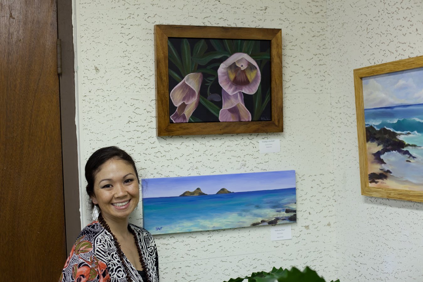 My dad has always loved to paint. I think the gene stopped with him. Well, maybe my sister Pam has some artistic qualities but I sure don't have any! I'm really good at drawing stick figures and happy faces. Anyways, he's been taking an adult painting class and for the month of May the student's artwork is being displayed at Ho'omaluhia's lecture room gallery. Tonight was the opening reception...